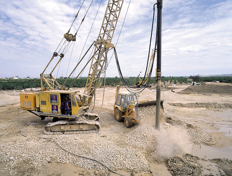 O vibrador desce, movimentando lateralmente o solo, até à profundidade planeada, graças ao ar comprimido e à condução estática da unidade.